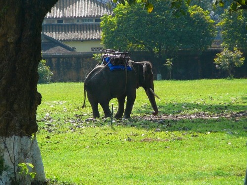 堀を渡って旧市街に入ると,広場の先に次の堀で囲まれた王宮があり,ベトナムの国旗が高々と掲げられていた。王宮の 中庭も広々としており,観光客を乗せて王宮内を散策するゾウが所在なげに草を食べていた。